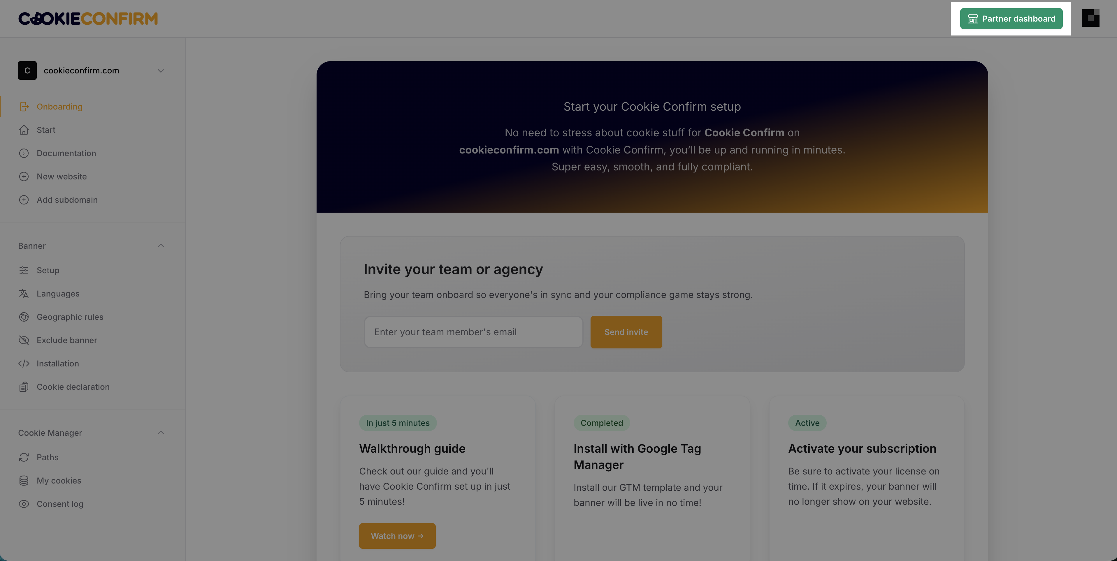 Click 'White label settings' at the top to adjust the banner settings to your own branding, so it appears as if your agency offers this product instead of Cookie Confirm.